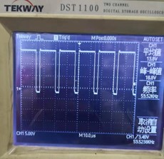 6,查看電源卡開關電源部分的圖紙,檢查IC2844的前級啟動電阻和整流橋均正常,最后檢查脈沖變壓器供給IC2844的次級供電回路,發現啟動電容降容超出15%,判定為損壞,將此電容更換后,再次上電機器顯示正常,測量開關管驅動波形正常,原故障修復。以下是2844輸出的正常波形。